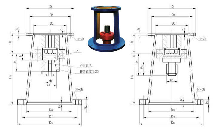 本機(jī)架適用于與擺線針輪減速機(jī)的聯(lián)接,配剛性聯(lián)軸器,上聯(lián)軸器裝JA型直孔,下聯(lián)軸器裝A型直孔或B型錐孔,錐度為1:20的聯(lián)軸器。該機(jī)架無支承適用于反應(yīng)器傳來的軸向力不大時(shí)使用。