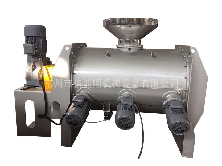 犁刀混合機(jī)由傳動(dòng)機(jī)構(gòu)、臥式筒體、犁刀、飛刀四部分組成。物料在犁刀作用下沿筒壁作對(duì)流運(yùn)動(dòng),當(dāng)物料流經(jīng)飛刀時(shí)被高速旋轉(zhuǎn)的飛刀拋灑,從而在短時(shí)間內(nèi)達(dá)到均勻混合,能滿足大多固液混合以及造濕粒、干燥等復(fù)合工藝。