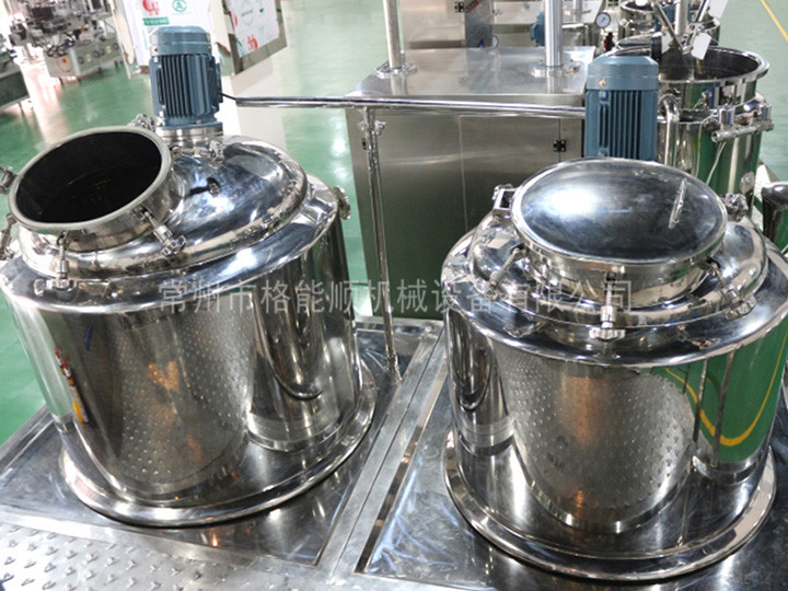 1、乳化鍋過為自動(dòng)升降式,水鍋、油鍋中的物料通過輸送管道可在真空狀態(tài)下直接吸入乳化鍋。